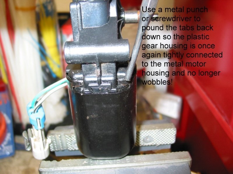 Picture showing the use of a punch to pound these tabs back down so the metal motor housing will no longer wobble on the plastic gear housing. This is a MUST DO prior to re-installing the headlight motor assembly back into the car to prevent future problems!