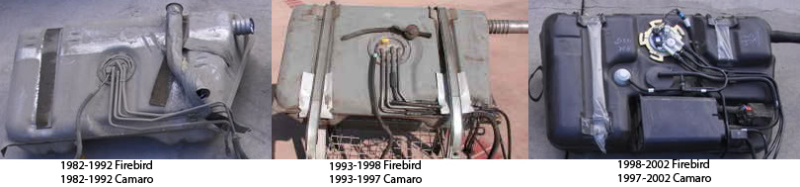 Tiem cilvēkiem, kuriem ir 92-98 gada Firebird vai Camaro, neatkarīgi no motora tilpuma, bākai būtu jābūt no metāla un sūknim pieskrūvējamam ar uzgriežņiem. 97/8 – 2002, bāka ir no plastmasas un sūknis stiprinās klāt ar sprostgredzena tipa riņķiem ar ķepiņām, kā arī izvietojums ir nedaudz vairāk uz bākas aizmuguri, degvielas caurules ir pa diagonāli pāri bākai. Precīzāku atšķirību var redzēt attēlā zemāk.