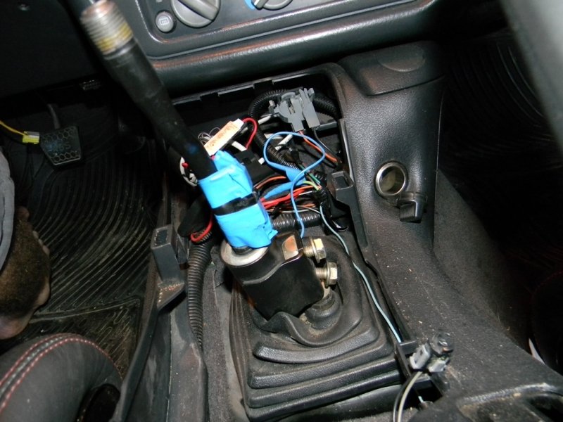 Tagad ir noņemta vidējā konsole un var ņemt nost ātrumkārbas kloķi (sviru). Atskrūvējam 2 skrūves kloķa sānā un ņemam to nost. Manā gadījumā tur ir pievienota vēl šādi tādi vadiņi, kas Jums nebūs, tāpēc tos ignorējiet.