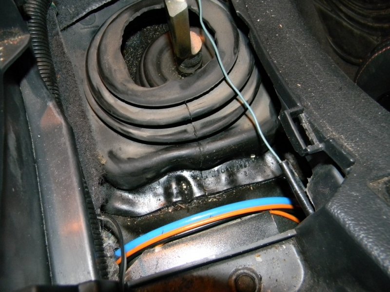 Nepieciešams noskrūvēt otru putekļu gumiju, kas nosedz ātrumkārbas pārslēga caurumu. Šī gumija var būt pieskrūvēt ar dažādām skrūvēm, atkarībā no tā vai kāds cits iepriekš jau ir kaut ko mainījis. manā gadījumā tās bija krustiņa skrūves, bet oriģināli būtu jābūt 8mm galviņas skrūvēm.