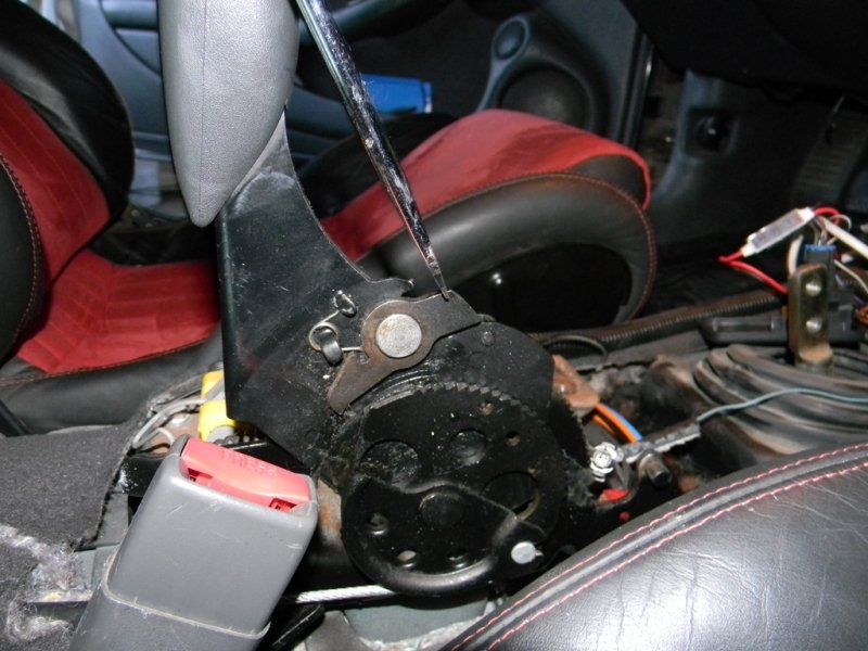 Tālāk, kad skrūves ir atskrūvētas paliek lielākā “problēma” – rokas bremze. Un šeit ir vidi varianti – viegls, bet neērts (pirmais) un nedaudz sarežģītāks, bet ērtāks (otrais). Pirmais variants – vienkārši noraut rokas bremzi un mēģināt izvilkt paneli. Otrais variants – paņemt plakano skrūvgriezni un nolaist to pa kreiso malu rokasbremzei cik dziļi vien var, bet man tas variants neizdevās, jo īsti nezināju, kur un kā tas skrūvgrieznis ir jāliek, tāpēc kā darīju es – nedaudz norāvu rokasbremzi, pavilku un pacēlu konsoli uz aizmuguri un augšu, līdz no sāna varēja redzēt rokasbremzes mehānismu un tad ar skrūvgriezni uzspiedu uz mēlītes, kas nofiksē rokasbremzi, tad pacēlu to augstāk un izņēmu konsoli, tad nolaidu rokasbremzi uz leju un vēlreizturot mēlīti pacēlu to uz augšu, tā atspriegojot rokasbremzi, bet atstājot pašu kloķi uz augšu, lai vēlāk var uzlikt konsoli.