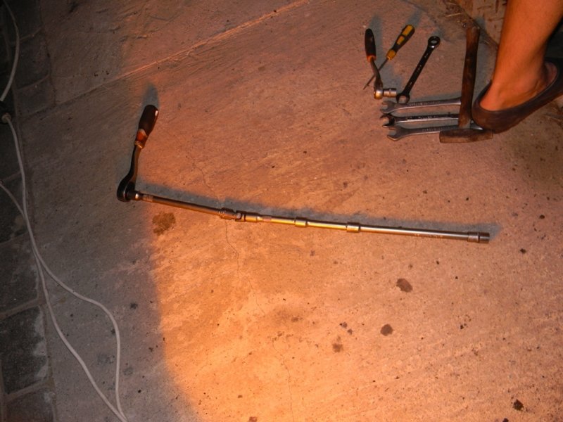 Kad tās skrūves ir atskrūvētas, var gadīties, ka kardāns iznāk brīvi, bet var gadīties, ka ir “iesprūdis”, kas būtu tikai normāli ņemot vērā to ar kādu ātrumu tam jāgriežas. Tad var paņemt lielāku skrūvgriezni vai taisnāku kazas kāju un ieliekot starp krustiņiem viegli uzspiest pa to galiem – spiežot uz vienu krustiņa galu, pretējam būtu nedaudz jāiznāk uz āru, tad kardānu pagriež un uzspiež uz otru galu un tad kardānu varēs izņemt. Ņem ārā lēnām un prātīgi to nenomtot. Manā gadījumā kardāns ir no alumīnija? (īsti nezinu) un tāpēc ir viegls, bet var būt arī no dzelzs sakausējuma un smagāks.